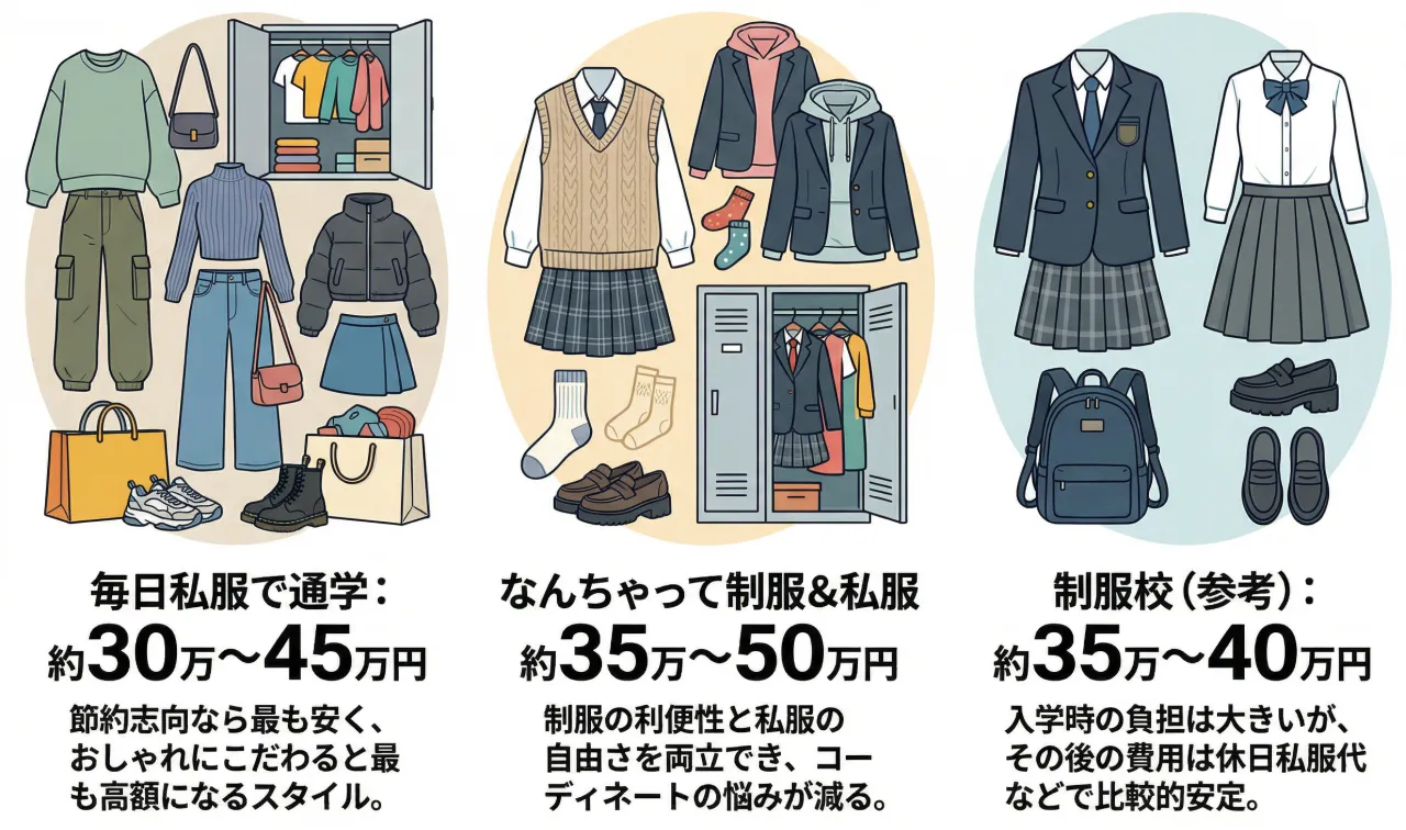 私服校と一口に言っても、実際の通学スタイルによって費用は大きく異なります。参考までに、3年間の概算費用を比較してみましょう。