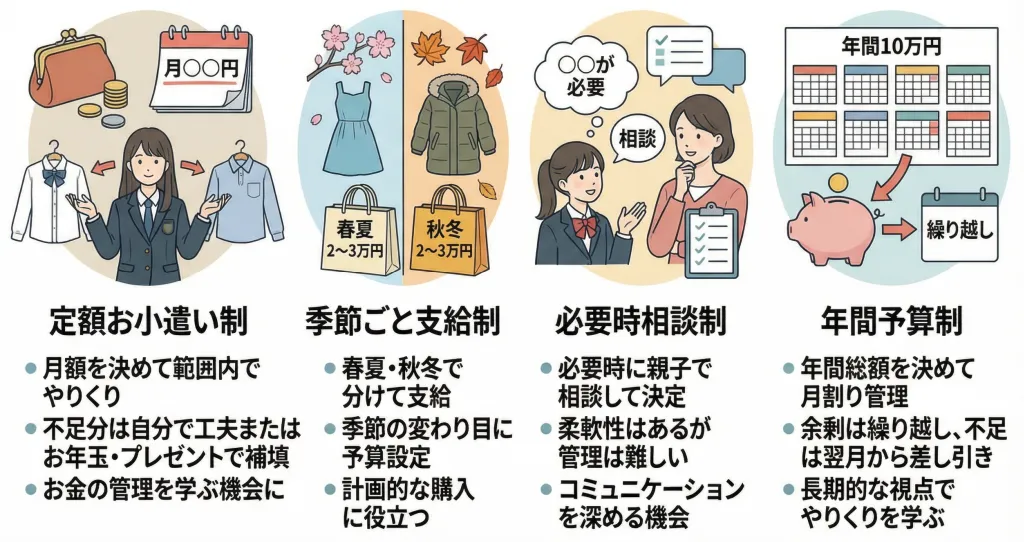 必要時支給制を取っている家庭では、「高価な服は親に2ヶ月に1枚買ってもらう程度で、普段は予算内で工夫している」「自転車通学で交通費が浮く分を服代に充てる約束で親に支援してもらっている」といった工夫をしているケースもありました。